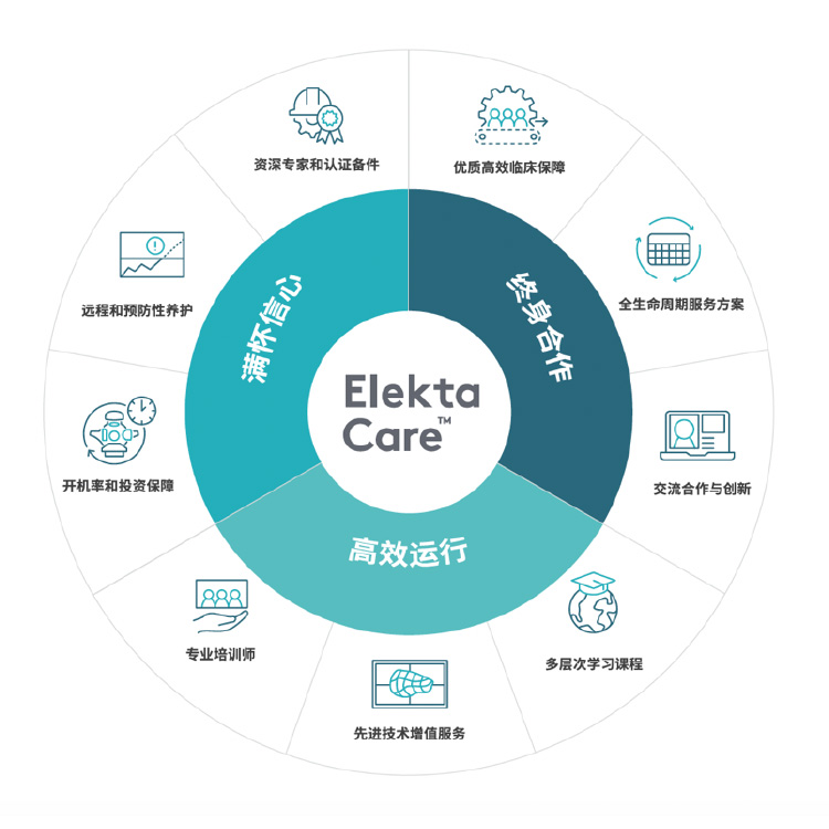 医科达致力于支持客户可持续、高质量的发展,为客户提供从解决方案设计研发、安装培训、临床应用、运维服务、升级更新、教育培训等一系列服务方案,支持用户所采用的放疗解决方案能在整个生命周期中发挥出最大的潜力,保障放疗系统的正常运行时间最大化,服务于临床高效、有竞争力的高水平地运营。